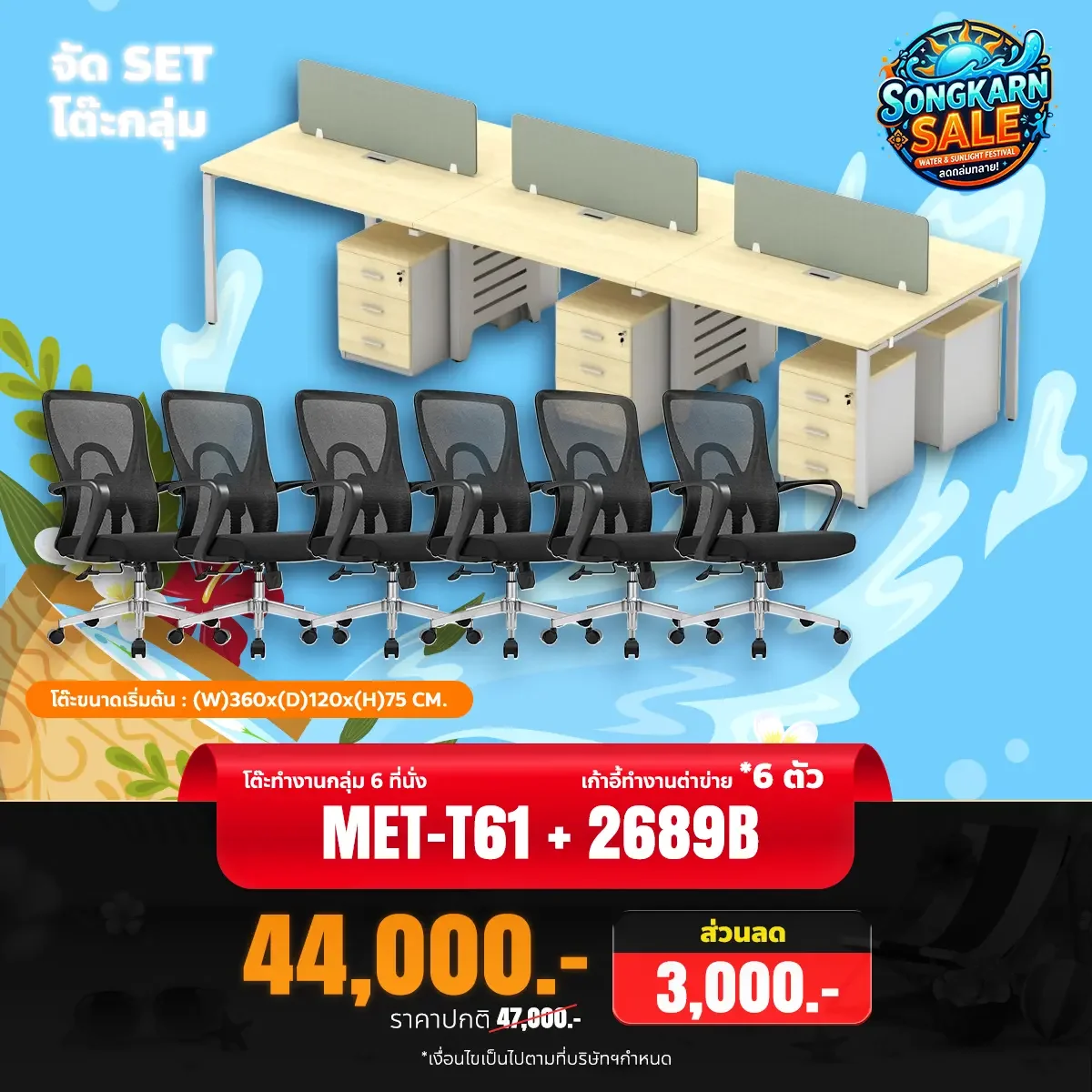 โต๊ะทำงานกลุ่ม 6 ที่นั่ง รุ่น MET-T61 พร้อมตู้ลิ้นชักและฉากกั้น