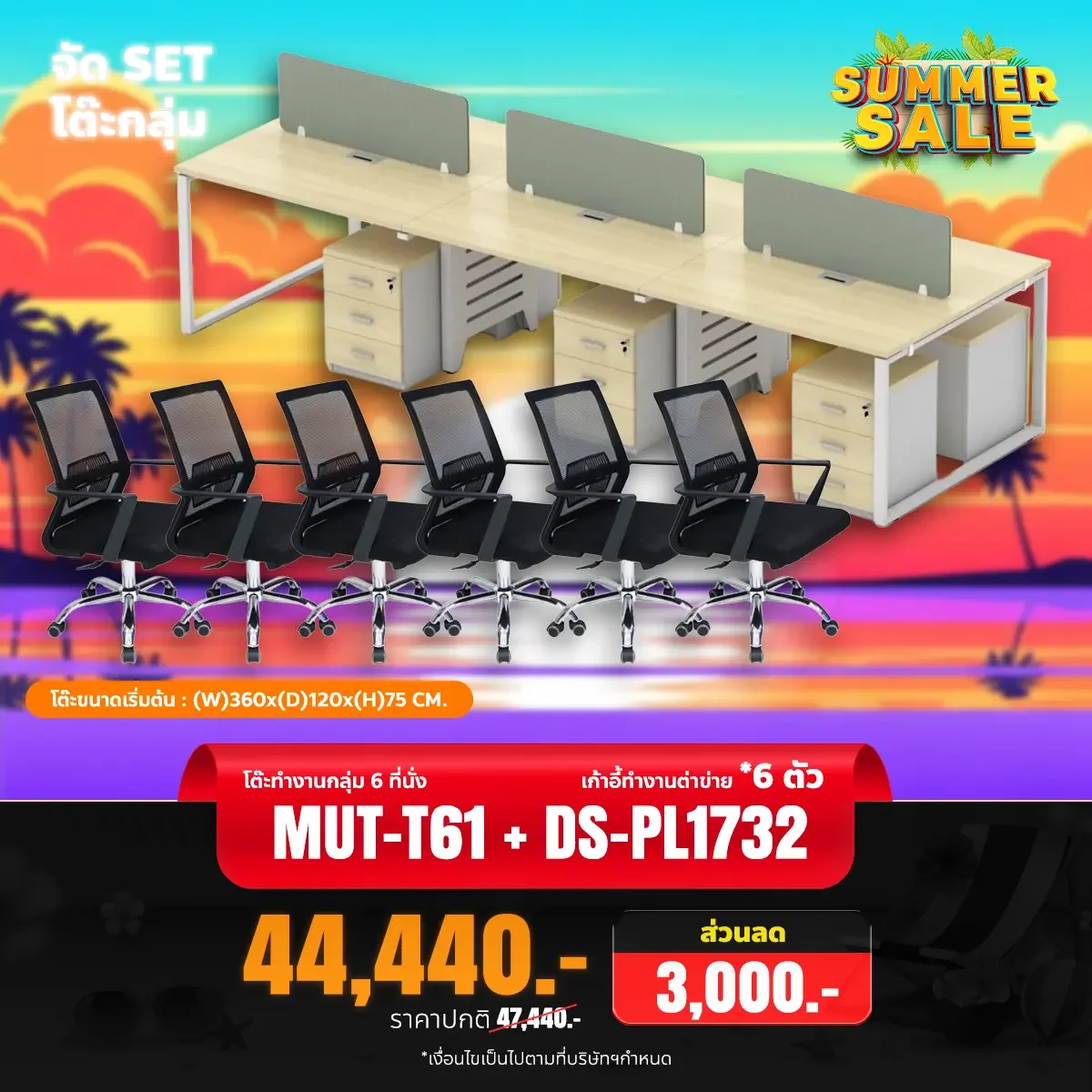 โต๊ะทำงานกลุ่ม 6 ที่นั่ง รุ่น MUT-T61 พร้อมตู้ลิ้นชักและฉากกั้น