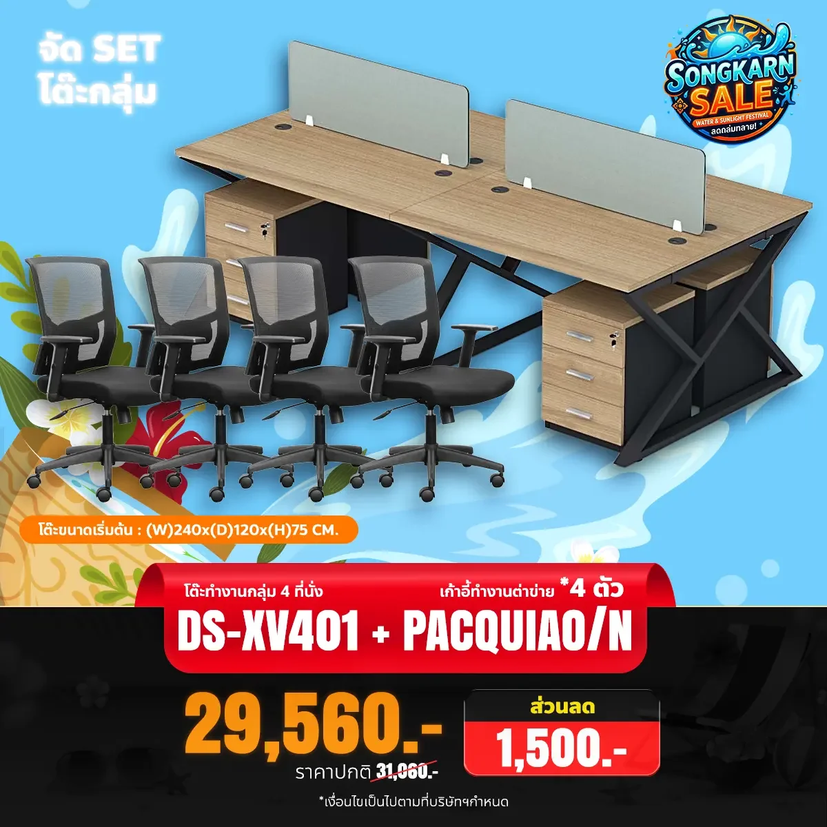 โต๊ะทำงานกลุ่ม 4 ที่นั่ง รุ่น DS-XV401 พร้อมตู้ลิ้นชักและฉากกั้น