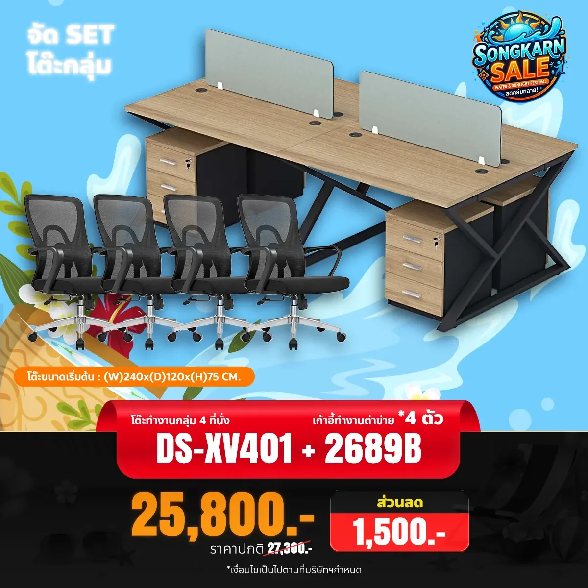 โต๊ะทำงานกลุ่ม 4 ที่นั่ง รุ่น DS-XV401 พร้อมตู้ลิ้นชักและฉากกั้น