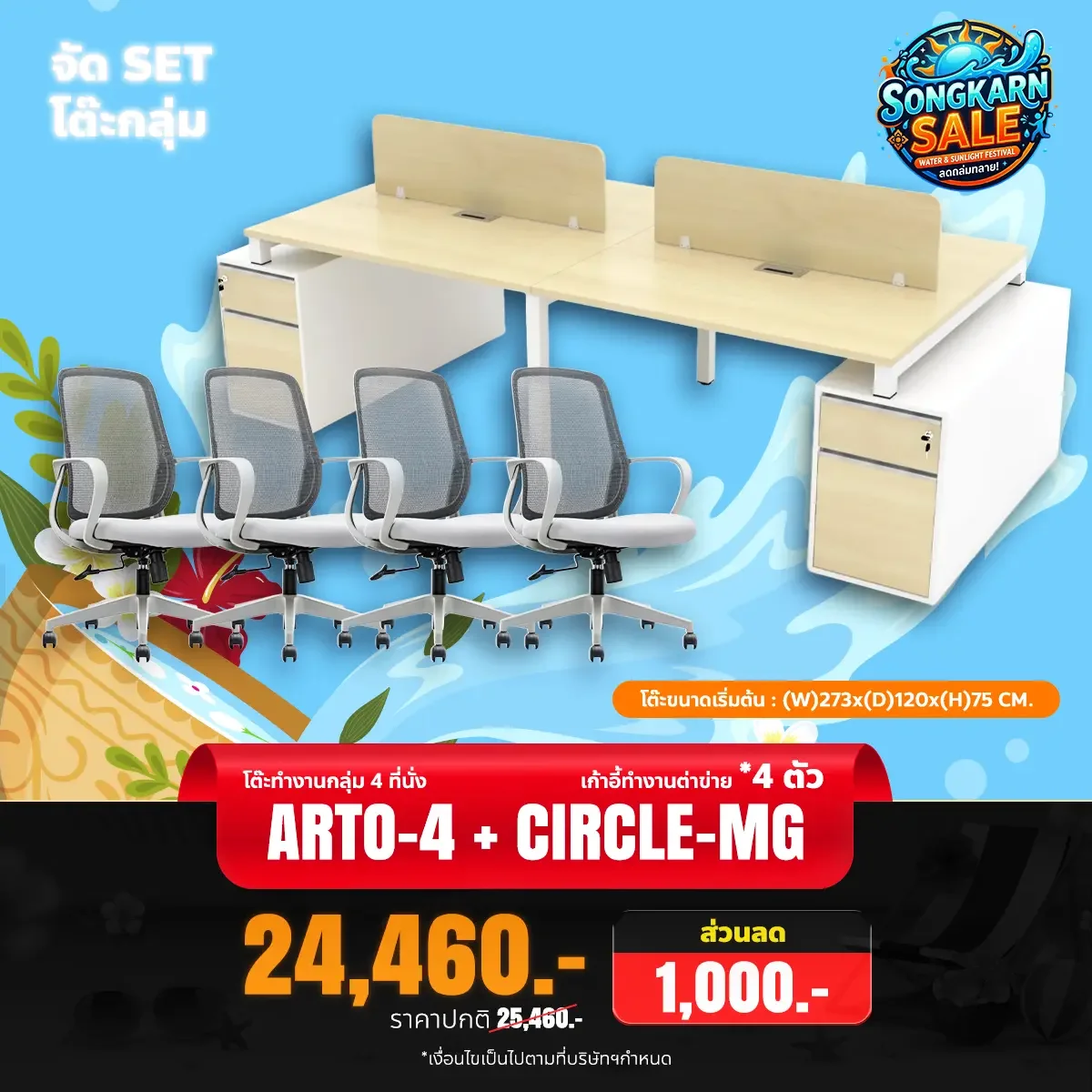 - ขนาดโต๊ะ ก273 x ล120 x ส75 ซม.