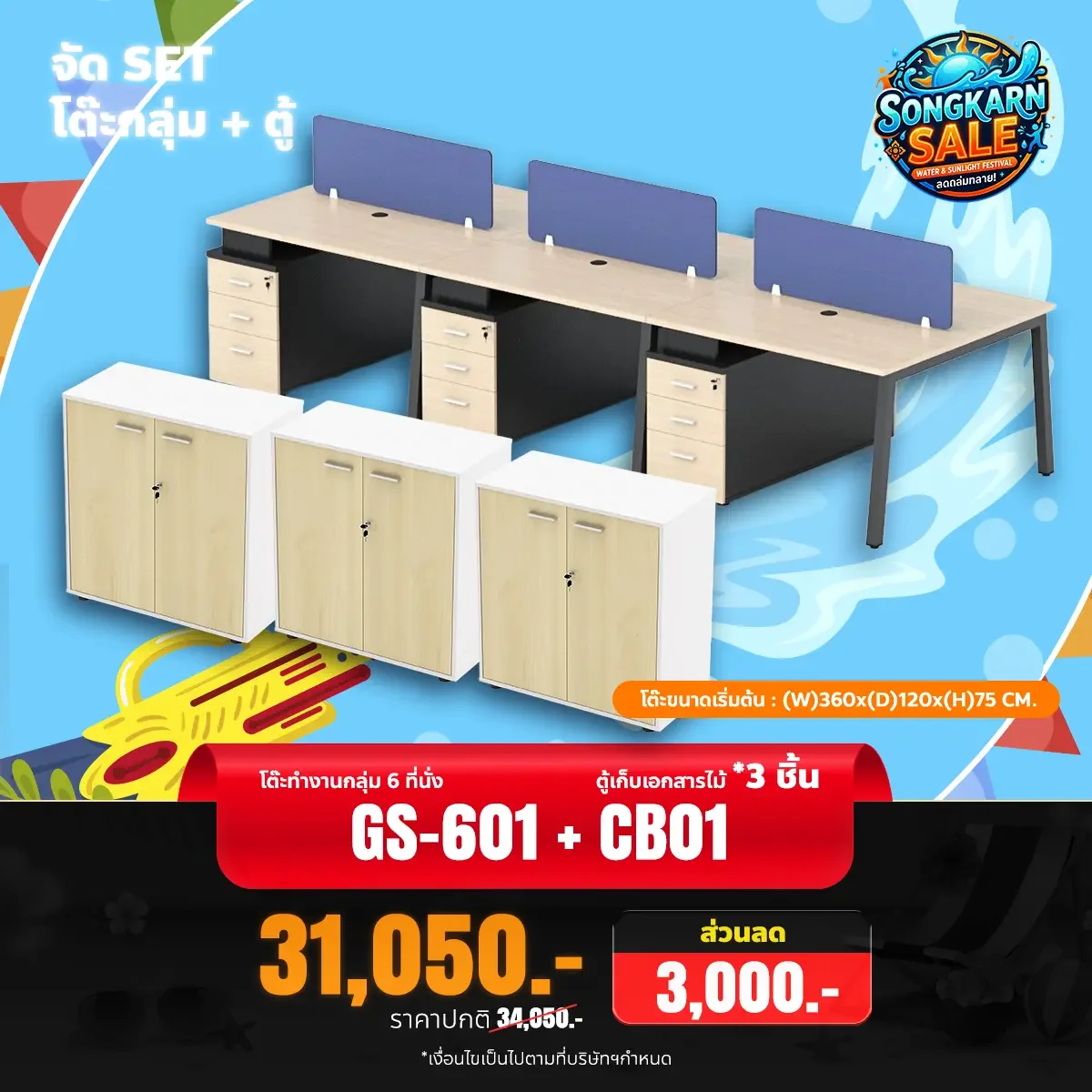 ชุดเซ็ตโต๊ะทำงานกลุ่ม 6 ที่นั่ง พร้อมตู้เอกสาร 3 ใบ