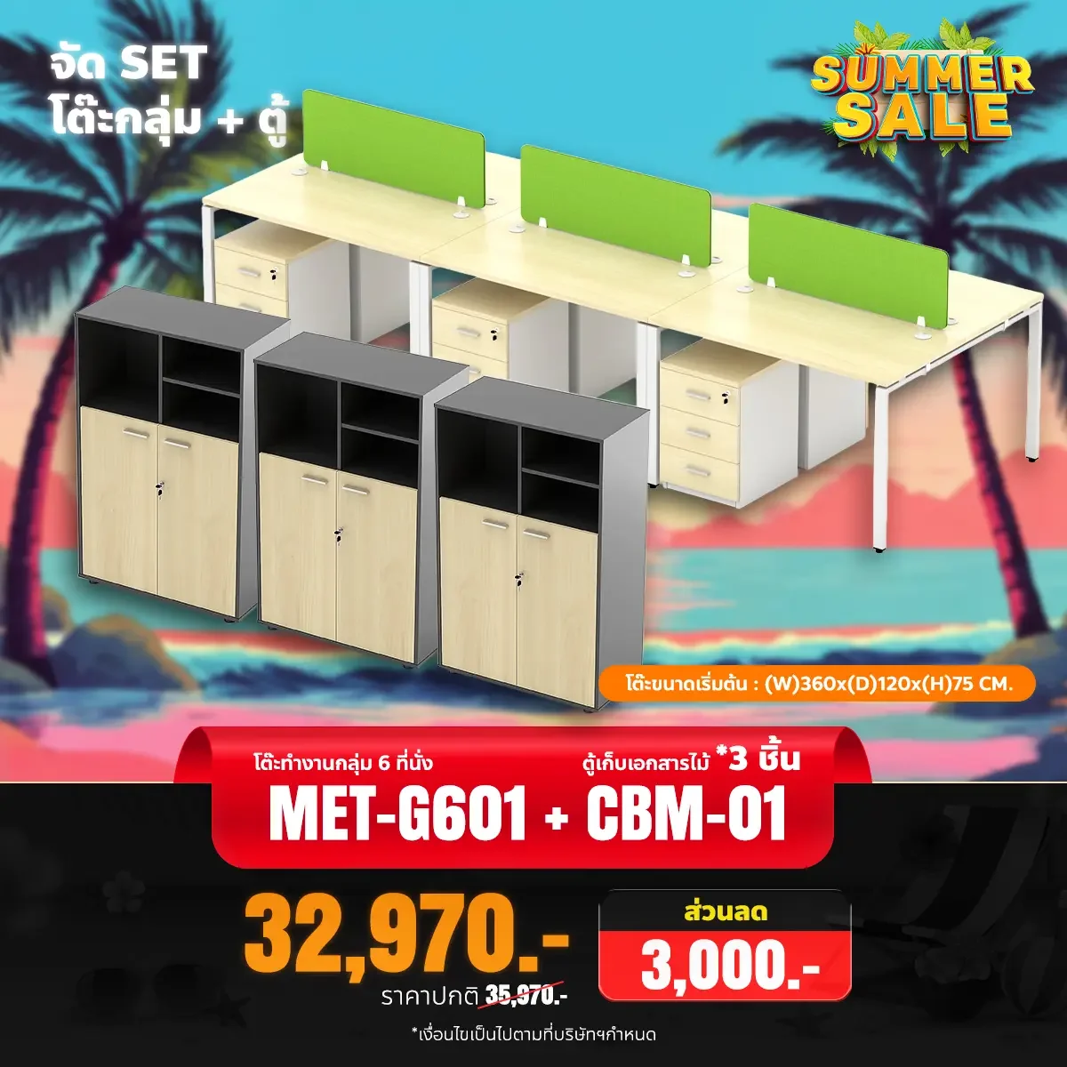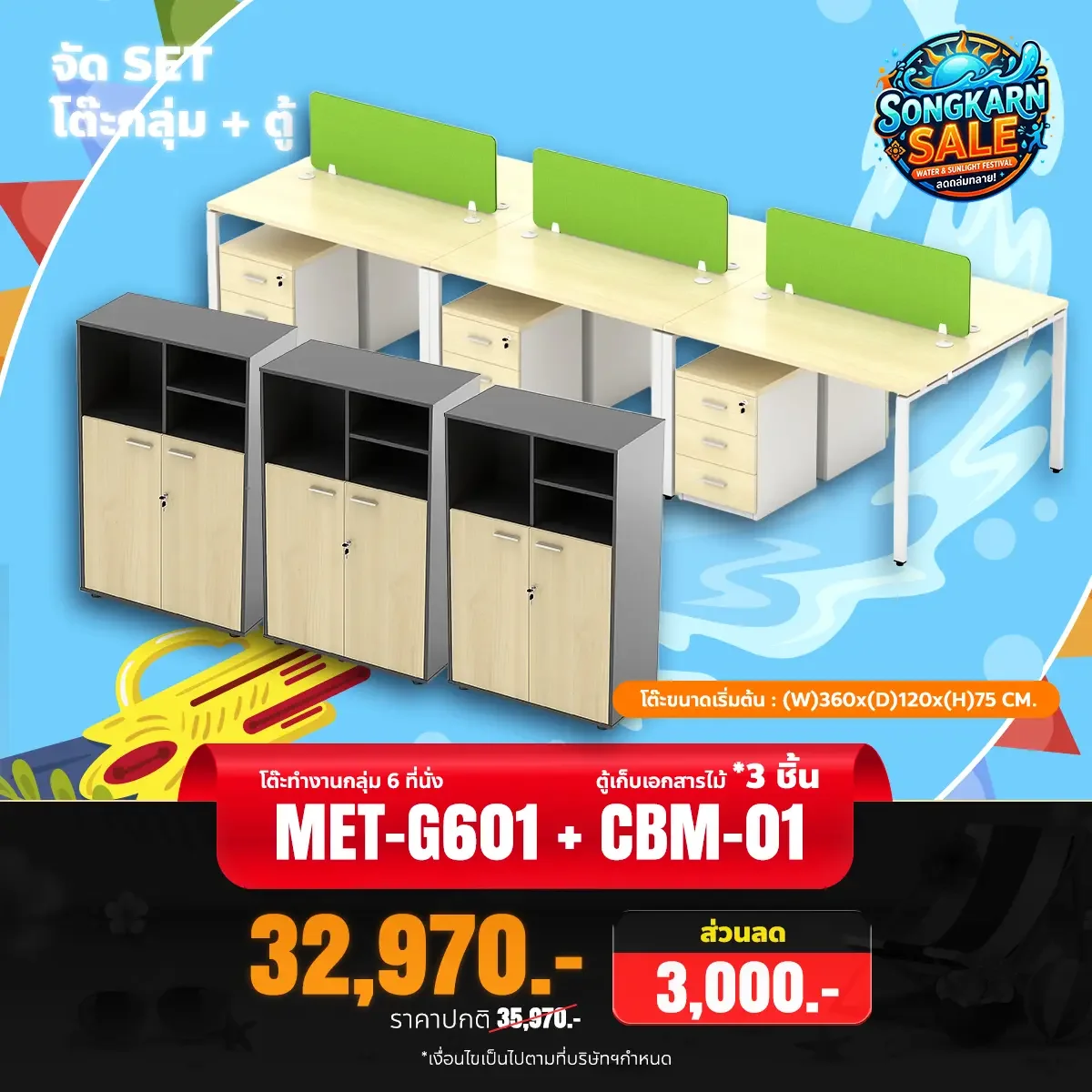 ชุดเซ็ตโต๊ะทำงานกลุ่ม 6 ที่นั่ง พร้อมตู้เอกสาร 3 ใบ
