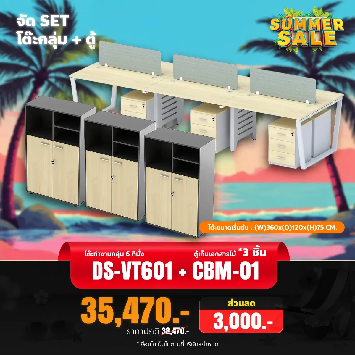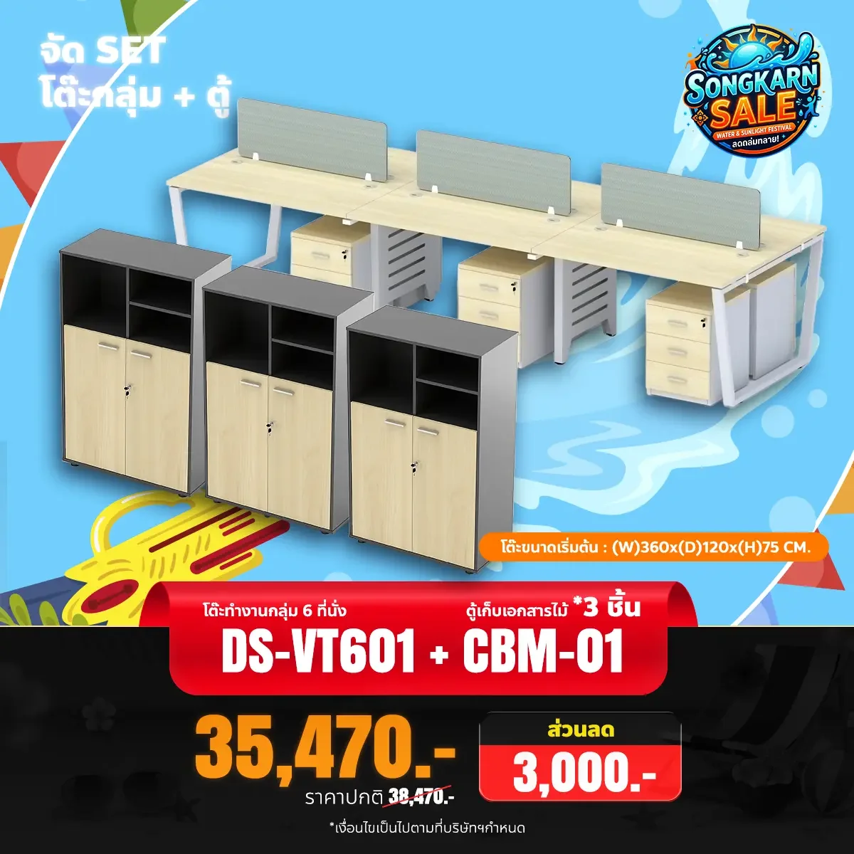ชุดเซ็ตโต๊ะทำงานกลุ่ม 6 ที่นั่ง พร้อมตู้เอกสาร 3 ใบ