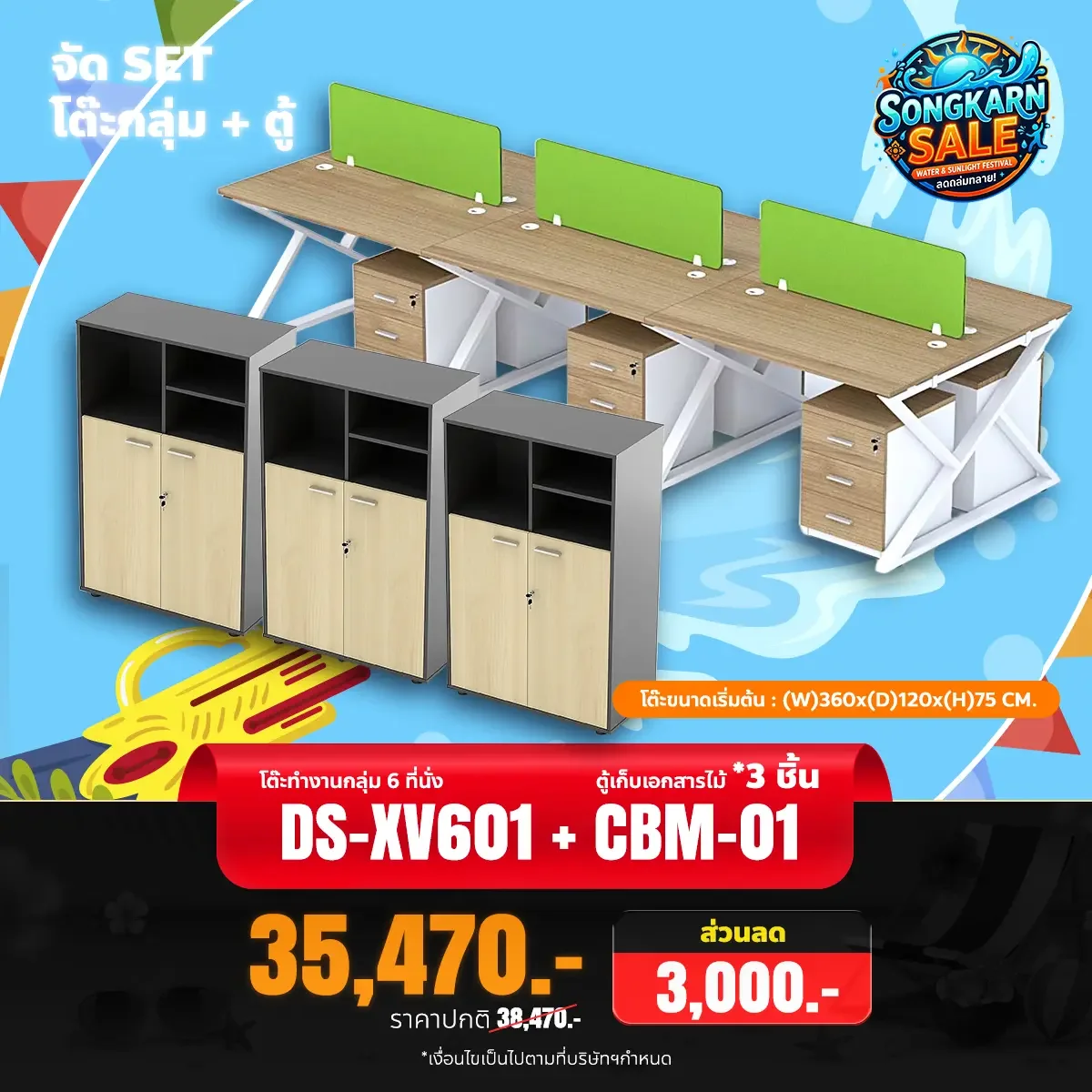 ชุดเซ็ตโต๊ะทำงานกลุ่ม 6 ที่นั่ง พร้อมตู้เอกสาร 3 ใบ