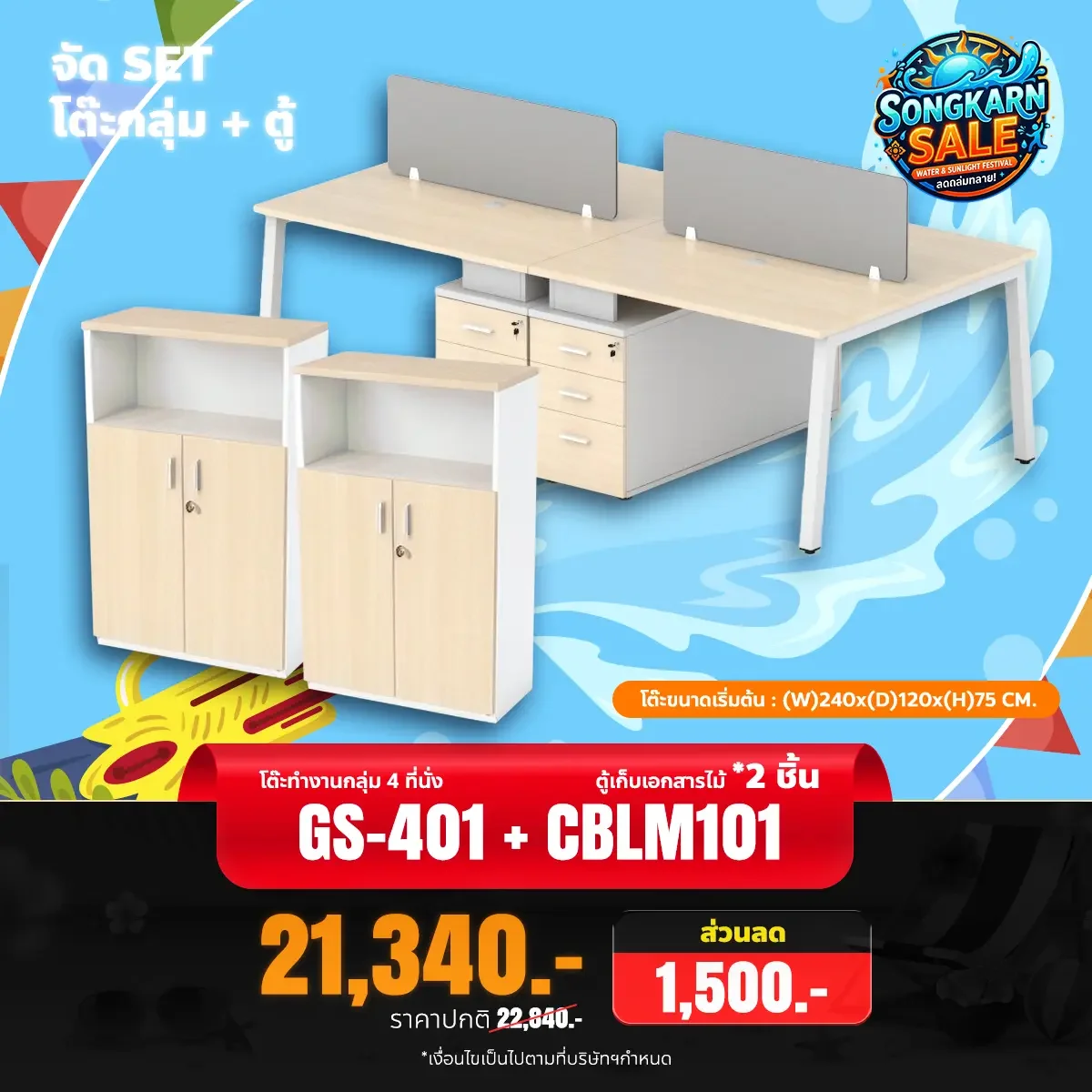 โต๊ะทำงานกลุ่ม 4 ที่นั่ง รุ่น GS-401 พร้อมตู้ลิ้นชักและฉากกั้น