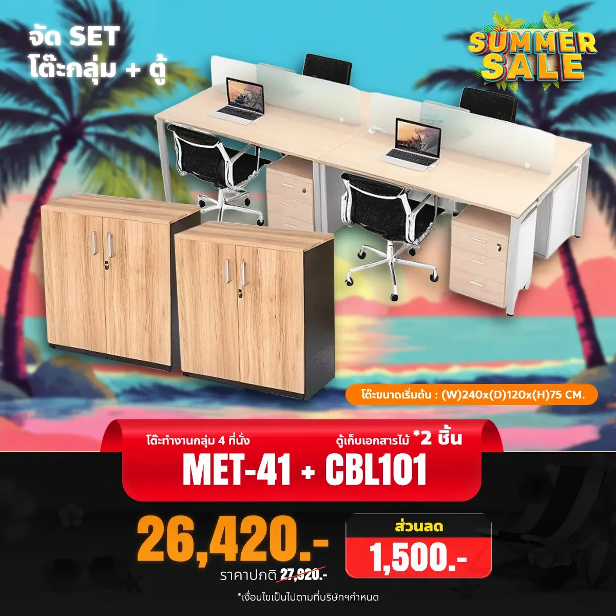 โต๊ะทำงานกลุ่ม 4 ที่นั่ง รุ่น MET-41 พร้อมตู้ลิ้นชักและฉากกั้น