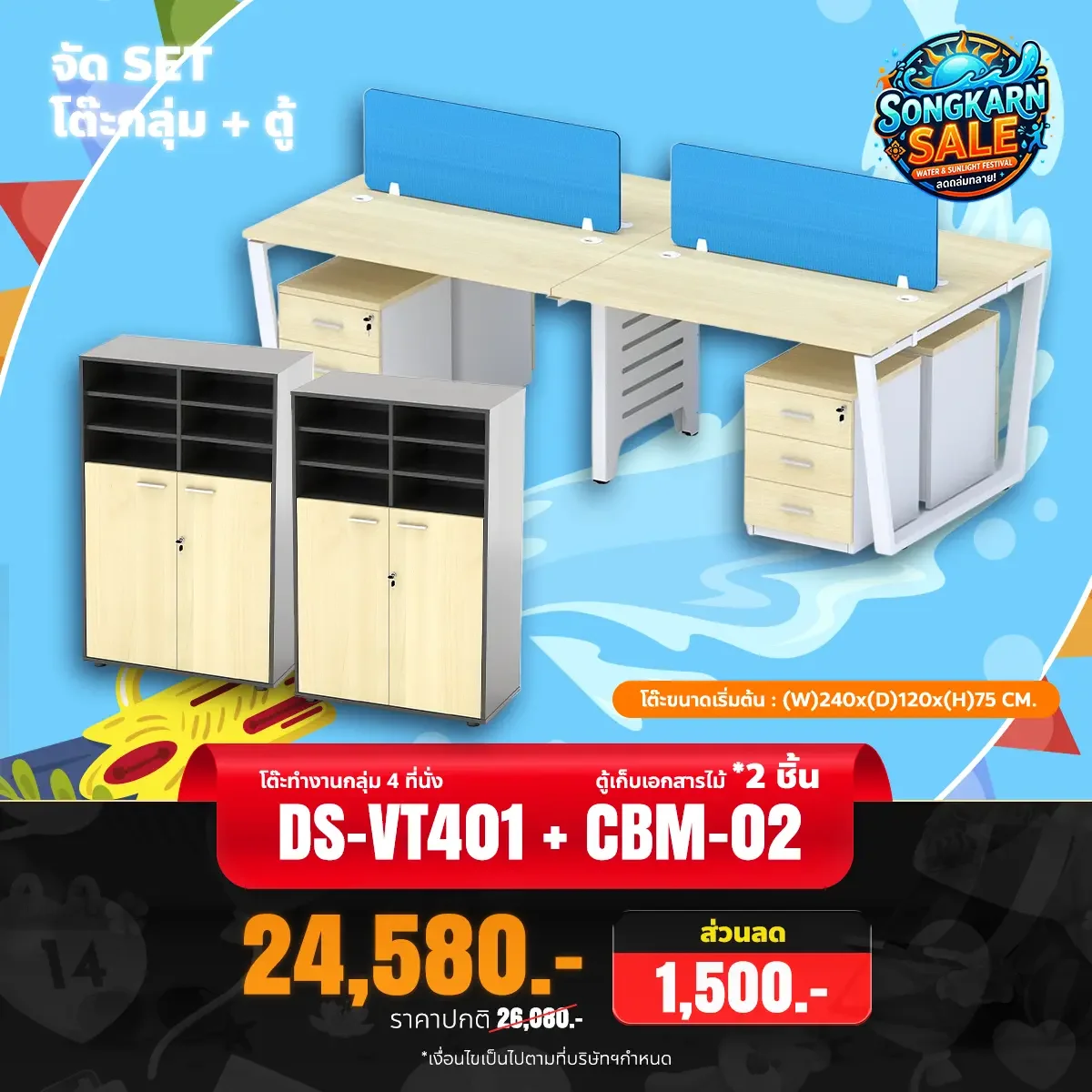 ชุดเซ็ตโต๊ะทำงานกลุ่ม 4 ที่นั่ง พร้อมตู้เอกสาร 2 ใบ