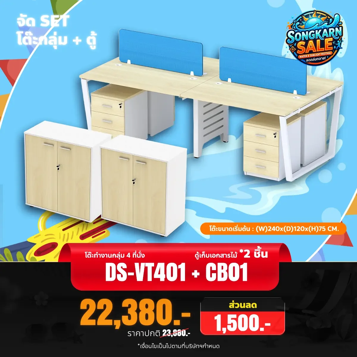 โต๊ะทำงานกลุ่ม 4 ที่นั่ง รุ่น DS-VT401 พร้อมตู้ลิ้นชักและฉากกั้น