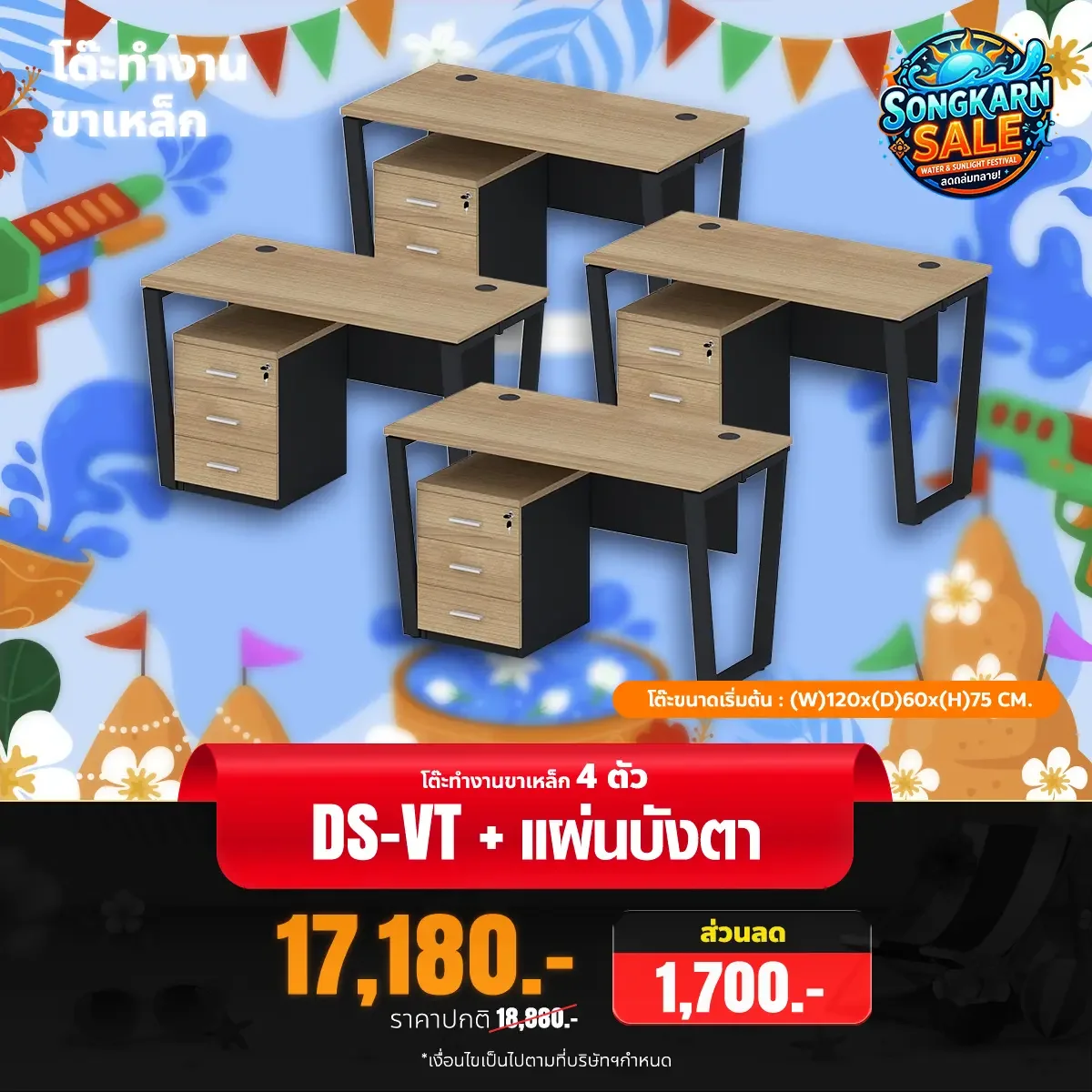 โต๊ะทำงานไม้ขาเหล็ก พร้อมตู้ลิ้นชักล้อเลื่อน 3 ชั้น จำนวน 4 ตัว