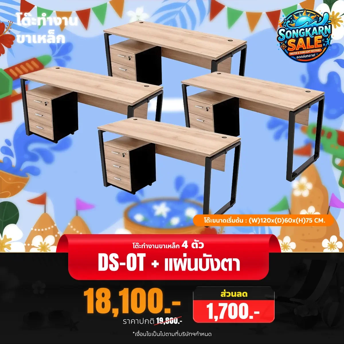 โต๊ะทำงานไม้ขาเหล็ก พร้อมตู้ลิ้นชักล้อเลื่อน 3 ชั้น จำนวน 4 ตัว