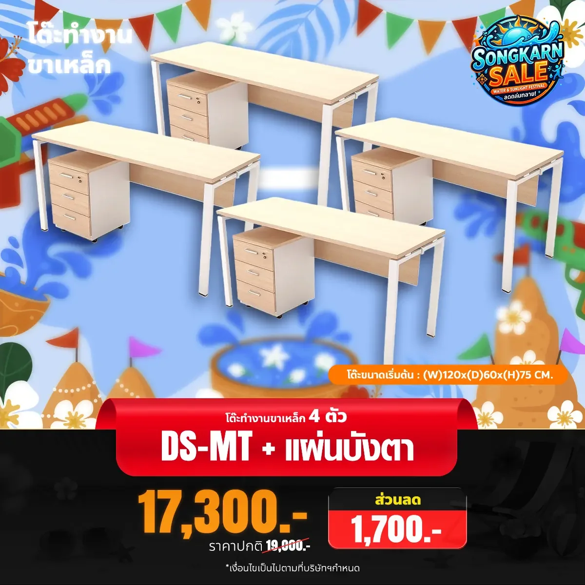 โต๊ะทำงานไม้ขาเหล็ก พร้อมตู้ลิ้นชักล้อเลื่อน 3 ชั้น จำนวน 4 ตัว